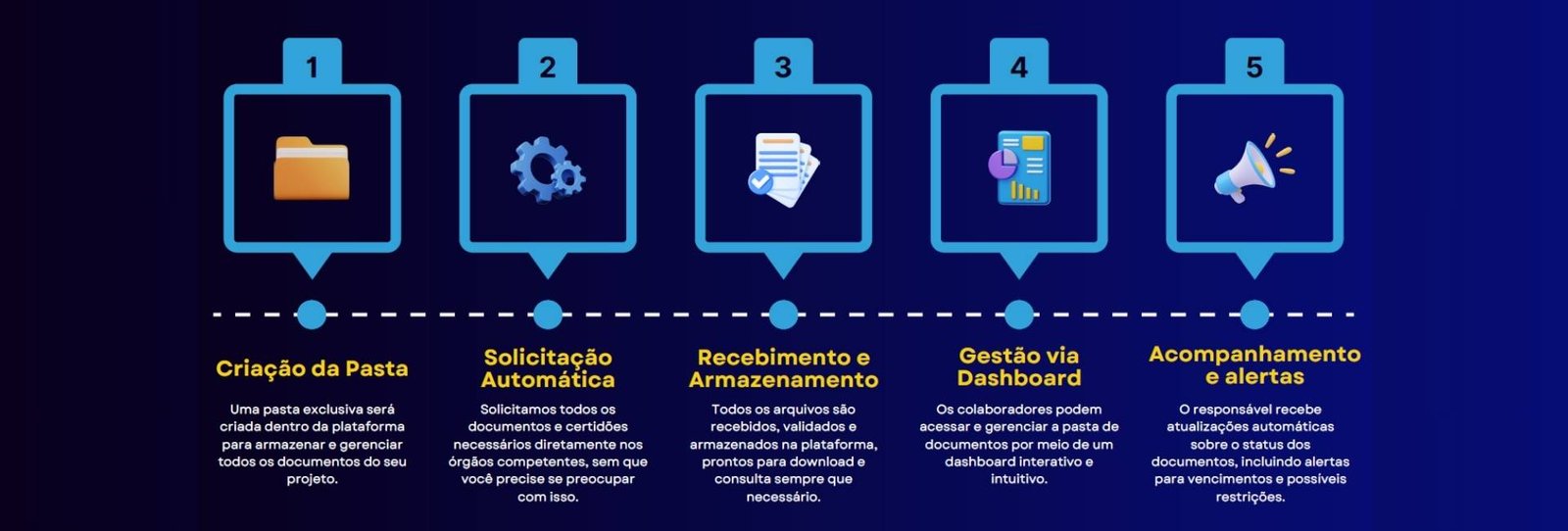 Nossa plataforma transforma a gestão documental das empresas ao centralizar toda a jornada de obtenção e análise de documentos e certidões em um só lugar.